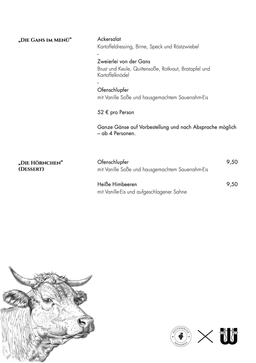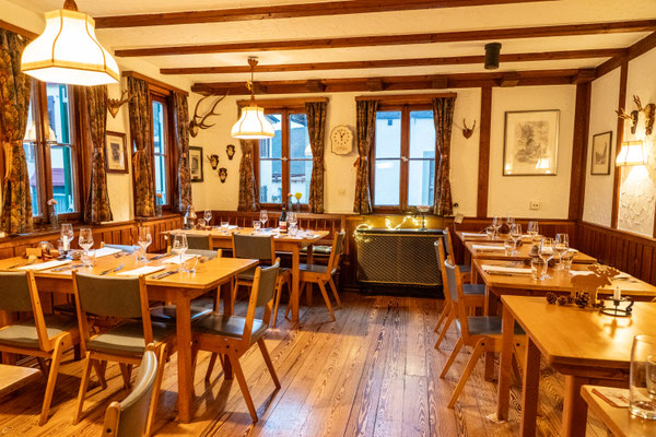 Heimische und saisonale Gerichte wie bspw. Spezialitäten von der Gans werden Donnerstag bis Samstag von 17:00 Uhr – 22:30 Uhr und sonntags von 11:00 Uhr – 15:00 Uhr serviert. Dafür stehen 2 Gaststuben im à la carte-Service und ein separater Gastraum für Gesellschaften mit bis zu 60 Personen zur Verfügung.